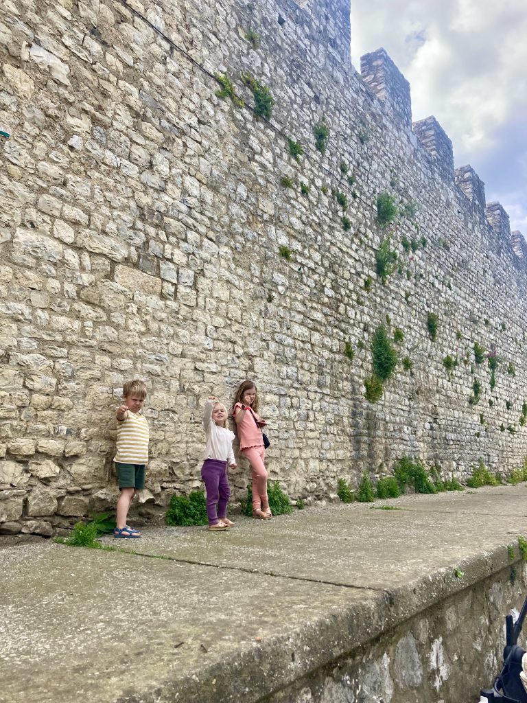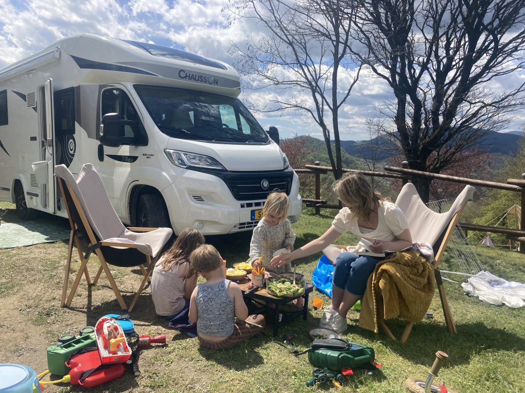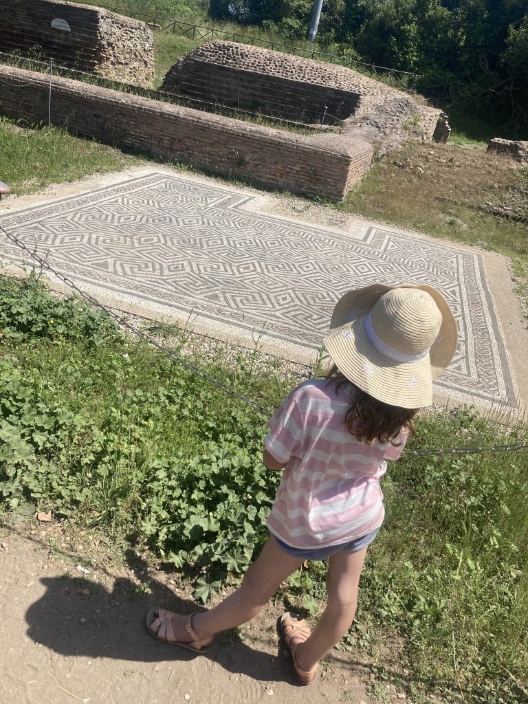 De volgende dag was Livia jarig en was het tijd voor cadeaus, slingers en natuurlijk opzoek naar taart! Doordat we vaak op de dag dat we gaan rijden ‘s avonds nog niet weten waar we slapen, zijn we ook niet altijd helemaal op de hoogte van waar we precies in de buurt verblijven. Dus toen we de volgende ochtend met de camper naar het dorpje, Castiglione della Pescaia, verderop reden en parkeerden in de parkeergarage vielen we van de ene in de andere positieve verbazing! We bleken aangekomen te zijn in een prachtig dorpje met vriendelijke mensen en boven op de berg een oud middeleeuws kasteel. Dus zo werd het taartje eten een dag vullend programma waarbij we afsloten met het spelen op het strand en er tijdens de lunch door Derk, Ezra en Amelie zelfs inktvissen gegeten werden! Aan het einde van de dag reden we verder richting Rome om bij natuur camping BoHo aan te komen, die eigenlijk pas 1 juni zou openen (wat wij over het hoofd hadden gezien), maar gelukkig vond de Nederlandse eigenaar het geen probleem dat wij nog ‘s avonds laat aankwamen en verbleven er nog twee andere Nederlanders die al 8 maanden op de fiets op reis waren. Op deze camping hebben we drie heerlijke rustige dagen gehad. Waarbij er wederom veel buiten gespeeld werd, Amelie en Ezra heel laat opbleven vanwege het kampvuur dat ‘s avonds aanging en wij het zelf ook erg gezellig vonden om ‘s avonds even met andere Nederlanders te kletsen. Op zondag hebben Amelie en Derk samen Ostia bezocht. Dit was in de tijd van de Romeinen de haven van Rome en de oude stad is daar opgegraven om te bezoeken. Een gedeelte van Amelie haar schoolwerk gaat over de Romeinen, dus hoe gaaf is het om zo de koppeling te maken tussen wat ze in het boekje leert en wat in het echt nog te bezoeken is!