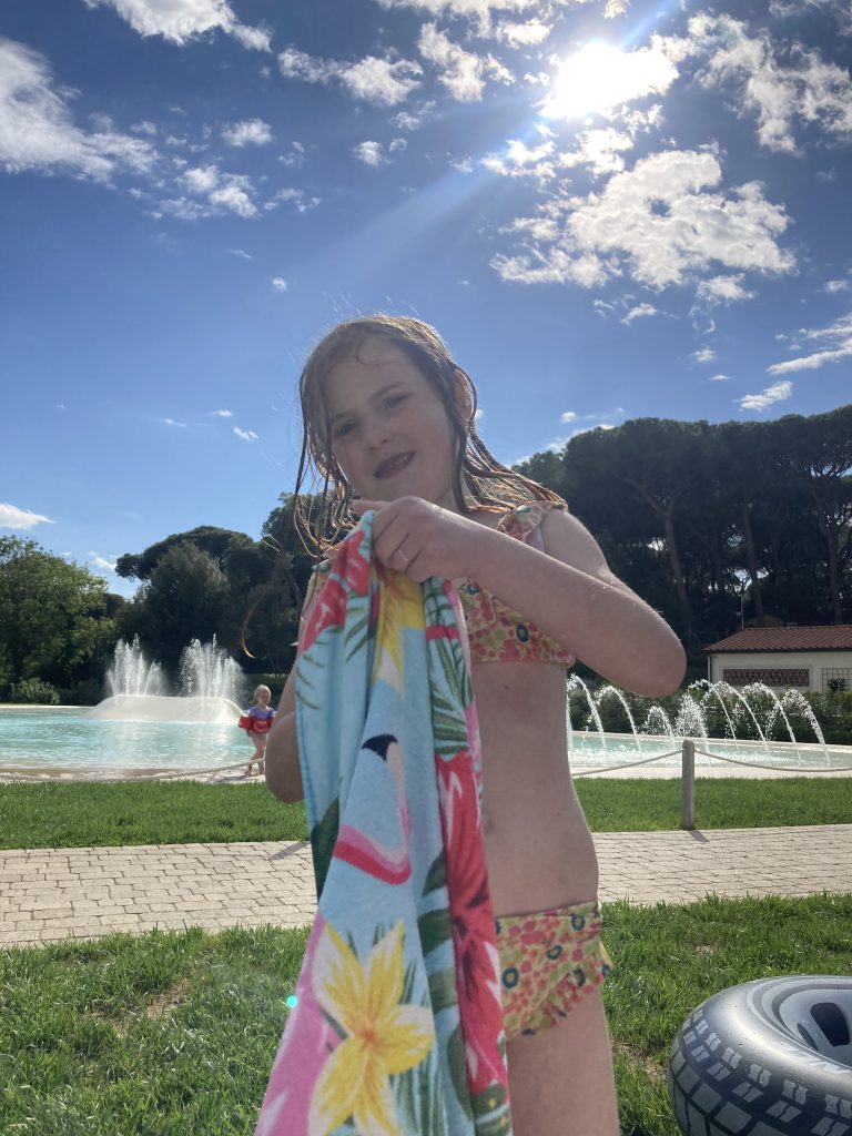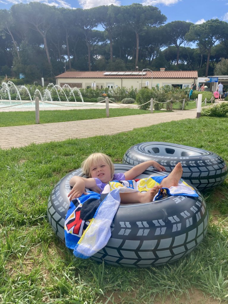 Hierna zijn we doorgereden naar camping Etruria aan de Toscaanse kust. Wat ons betreft een absolute aanrader voor een vakantie met kleine kinderen in het voor seizoen! We hadden een kampeer plek op 2 minuten lopen van het zandstrand en aan de andere kant van de camping was een verwarmd zwembad en een groot zwembad met alleen ondiep water en glijbanen waar Amelie en Ezra zelf vanaf konden. Hier hebben ze zich dus heel goed vermaakt. En vanwege de meivakantie in Nederland waren er ook genoeg Nederlandse kinderen om mee te spelen. Dus op deze camping zijn we vier nachten gebleven en hebben Amelie en Derk zelfs twee keer samen de zonsondergang op het strand bewonderd. Alle weken op reis voelen als vakantie, maar dit vond ikzelf even het ultieme vakantie gevoel, ook omdat de temperaturen flink hoog waren!